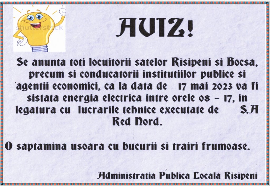 Se aduce la cunoștința tuturor locuitorilor satelor Risipeni și Bocșa, că au demarat lucrările de lichidare completă a tuturor gunoiștilor. Din aceste considerente Vă atenționăm, că până la data de 24 martie 2023 mai puteți încă să transportați deșeurile la gunoiștile existente.