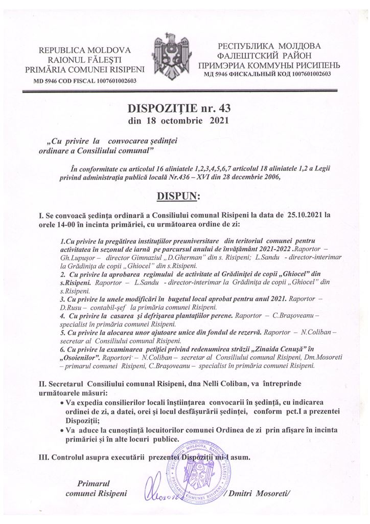 Se convoacă ședința ordinară a Consiliului comunal Risipeni la data de 25.10.2021 la orele 14-00 în incinta primăriei Risipeni, cu următoarea ordine de zi: