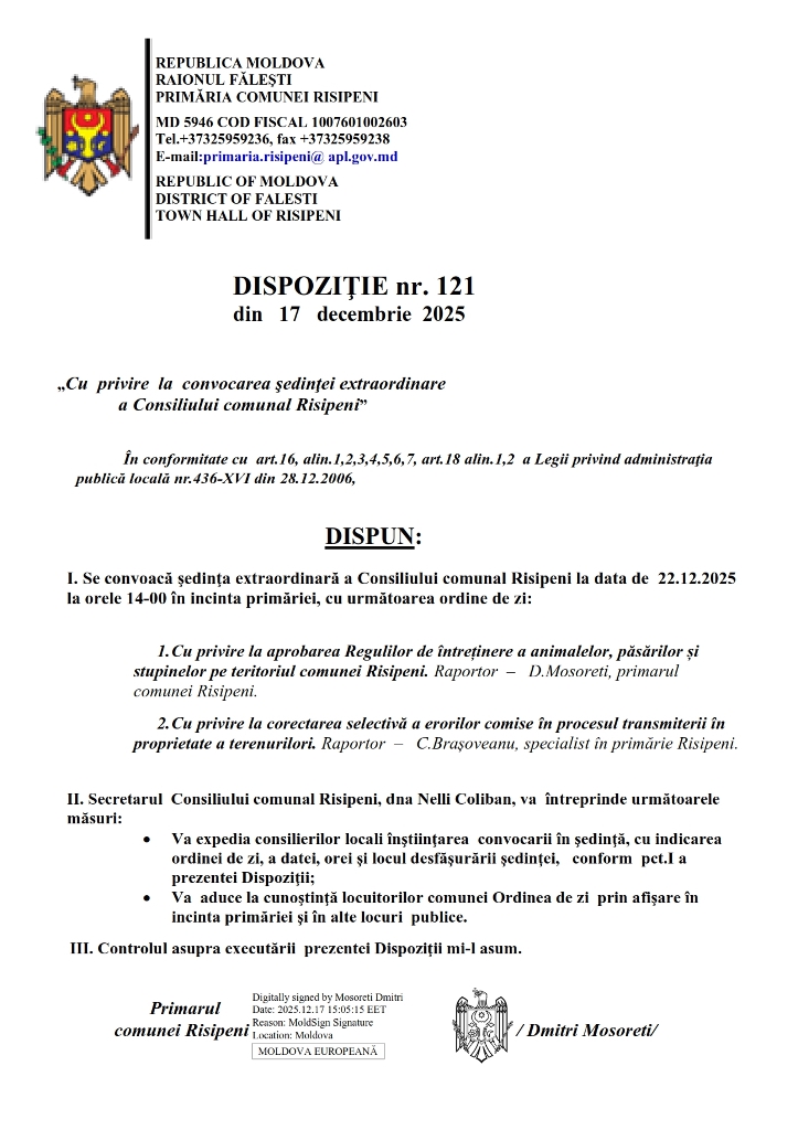 Vă aducem la cunoștință, că în temeiul Dispoziției primarului Nr.121 din 17.12.2025, se convoacă şedinţa extraordinară a Consiliului comunal Risipeni, la data de 22.12.2025, ora 14:00, în incinta primăriei Risipeni, cu următoarea ordine de zi: