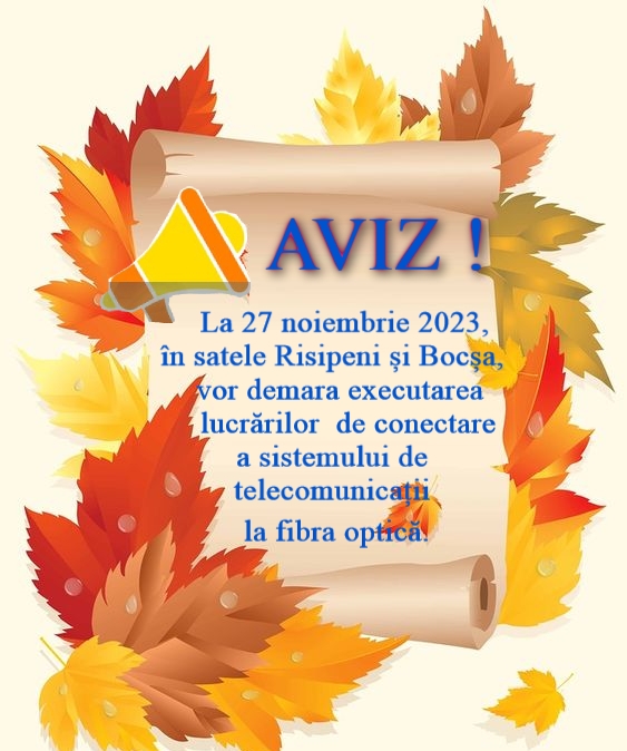 Astfel la 27 noiembrie 2023, în satele Risipeni și Bocșa, vor demara executarea lucrărilor de conectare a sistemului de telecomunicații la fibra optică.
