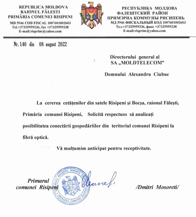 În rezultatul înaintării de către primarul comunei Risipeni, dl. Mosoreti Dmitri, a Demersului Nr.140 din 08.08.2022, la SA ”Moldtelecom în vederea examinării posibilității de conectarea a gospodăriilor din comuna Risipeni la fibra optică, operatorul a aprobat reabilitarea sistemului de telecomunicații din localitate, prin montarea rețelei de fibră optică.