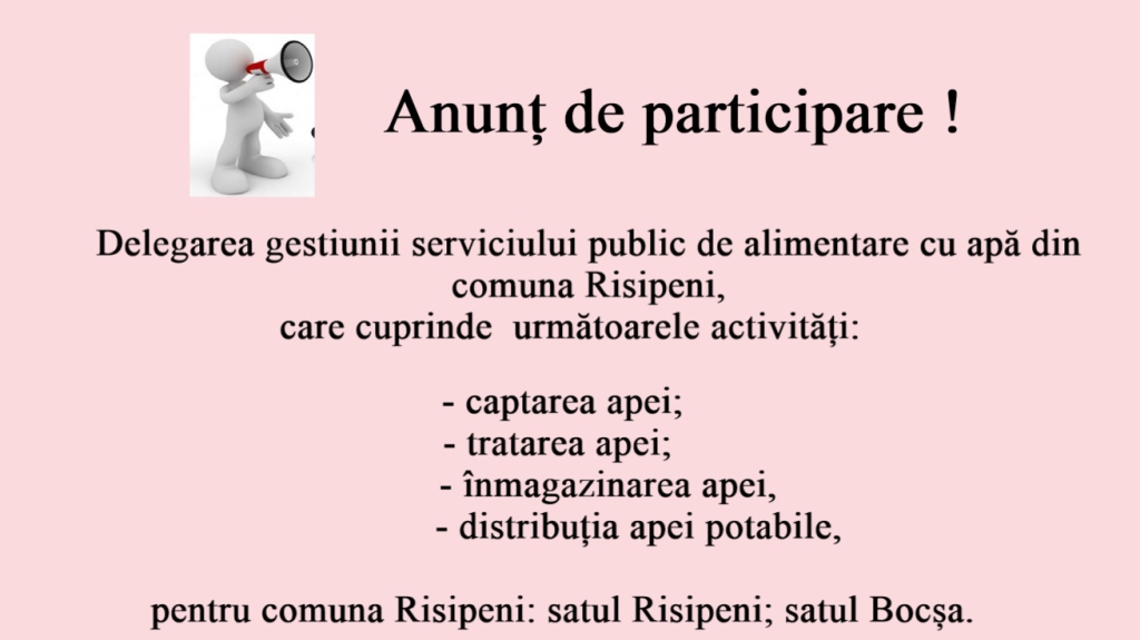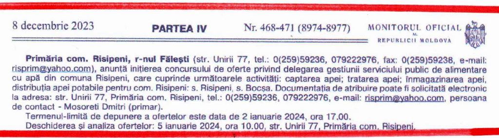 Deschiderea și analiza ofertelor: 05 ianuarie 2024, ora 10:00 primăria comunei Risipeni, str. Unirii nr. 77.