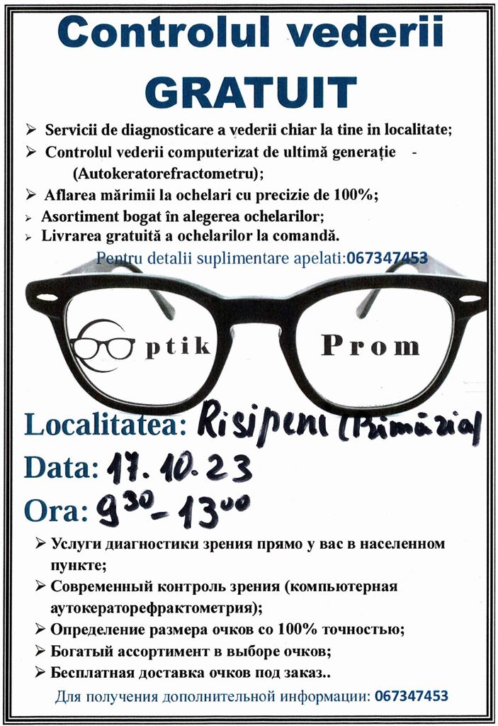 Mâine, 17 octombrie 2023, între orele 9:30-13:00, în incita primăriei Risipeni, va fi organizat controlul gratuit al vederii de către Optik Prom.